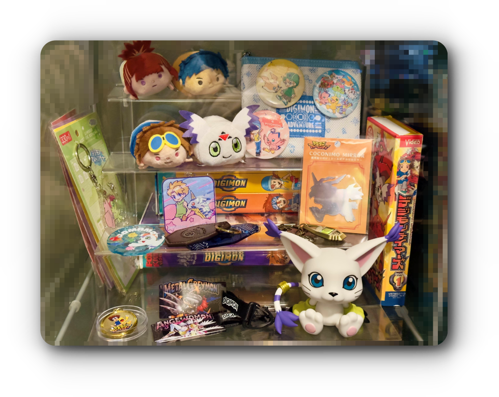 I've shared a pic of my small shrine below. Not shown here are all of my pre-exisiting childhood Digivices, cards, and assorted trinkets. We may be moving soon, so once the collection is recollected in a proper place, I'll make another update to share everything else! And if you'd like to see anything listed up close, please let me know in the guestbook and I'll update it to the Shrine tab. Enjoy! :)